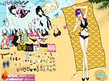 Choose the best bathing suits and bikinis and try them on the girl that is taking a sun bath.
