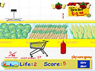 Shoot all the flying tomatoes and catch them with the shopping cart.