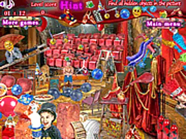 Zanurz się w ekscytującą atmosferę cyrku w tej wspaniałej darmowej grze w ukryte obiekty i znajdź różnice od Hidden-Object-Online.com. Idź na arenę i znajdź wszystkie ukryte obiekty, aby przygotować się do przedstawienia. Co za bałagan panuje za kulisami! Szukaj i zbieraj wszystkie petardy na występ klauna. Twoim zadaniem jest dostrzeżenie wszystkich różnic na trzecim poziomie. Ciesz się grą w tę doskonałą darmową grę, w której Twoje umiejętności wyszukiwania i znajdowania zostaną wystawione na próbę jak nigdy dotąd!