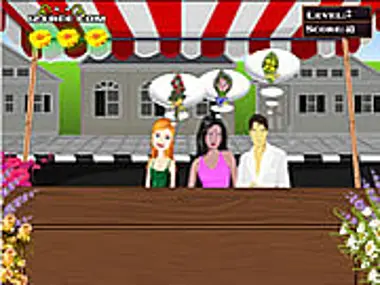 Memorize the customer's ordered bouquets before it disappears from the screen.When the orders appear beneath the table,drag the flower bouquet to the appropriate customers.If you deliver a perfect bouquet,your score will increase.
