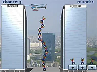 Create a tower of people up to the helicopter. Don't let them tip over!