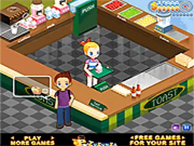 Sklep z przekąskami. Pracuj w sklepie i sprzedawaj przekąski swoim klientom! Twoim celem jest obsługa klientów. Gotuj kanapki, przygotowuj kawę, mleko i koktajle owocowe. Uważaj, żeby nie przypalić chleba i jajek. Kliknij najpierw na kanapkę, potem na jajko i keczup, aby dokończyć przygotowywanie kanapek.