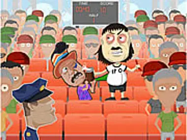 Hit the soccer fan and try to not get caught by the guard.
